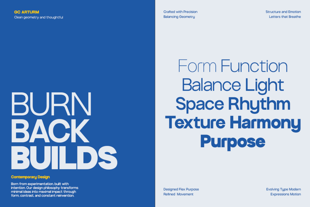 Perfect for branding, user interfaces, motion graphics, editorial layouts, and corporate design, GC Arturm delivers a confident and contemporary presence. Each character is crafted for optical harmony, ensuring legibility and visual consistency across every weight and size.